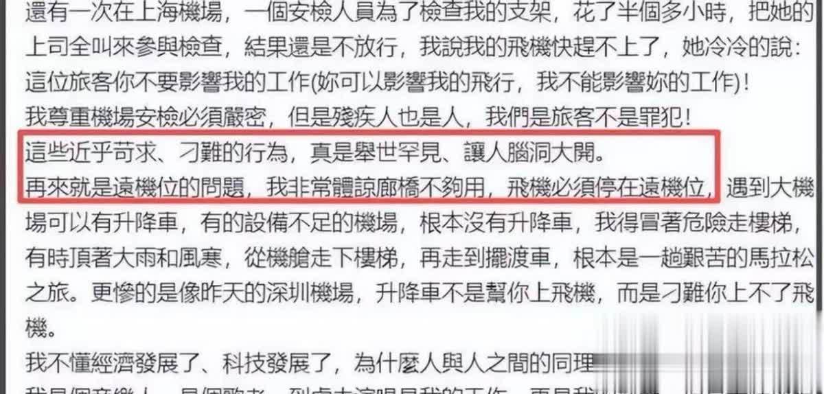 先是提出自己在南京因为特制的金属鞋被安检“刁难检查”,后又说道,新疆机场粗鲁的被安检人员要求,不能用拐杖。