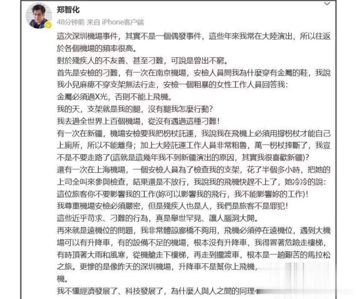 上周六,也就是10月25日,台湾歌手郑智化发布了一条微博,微博直接向深圳机场开腔,大有老虎不发威的架势。